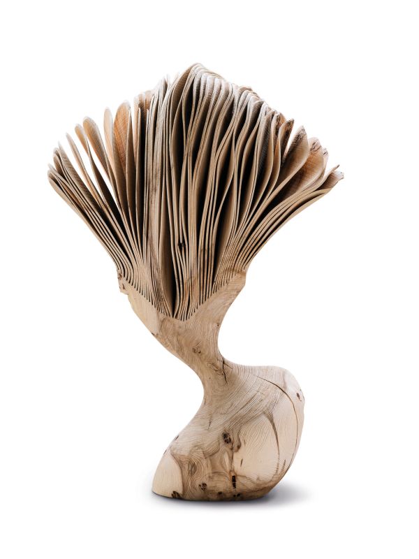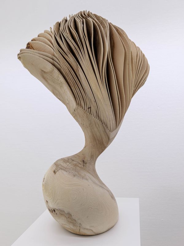Beim Herausschneiden der Figur aus einheimischen Laubhölzern ist es für den Künstler wesentlich, die Maserung und die im Holzstück verborgenen Astansätze zu berücksichtigen. und in die Gestaltung mit einzubeziehen. Beim oft schwungvollen Schleifen der Grundform, darf die Oberfläche nie so glatt werden, dass sie sich anfühlt wie Kunstsoff. Für Lars Zech muss nicht nur optisch, sondern auch über die Haptik die Natürlichkeit des Werkstoffes Holz erfahrbar bleiben; ein Grund, warum die Skulpturen nie lackiert werden. Mit der Einsägung folgt nun der wichtigste und kritischste Schritt bei der Bearbeitung. Ist am Ende dieses Prozesses die Form so, wie sie sich der Künstler vorgestellt hat, werden die Einschnitte aufgefaltet, gefächert. Die Skulptur schwingt nun nicht nur um ihre Achse, sondern öffnet sich nach oben und außen, so dass weitere Bewegungsimpulse ermöglicht und sichtbar werden.