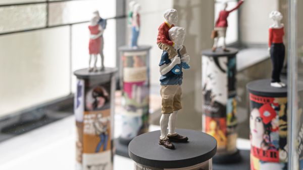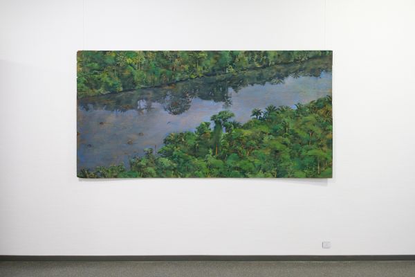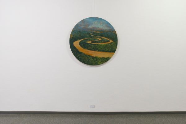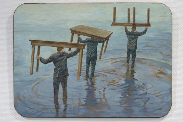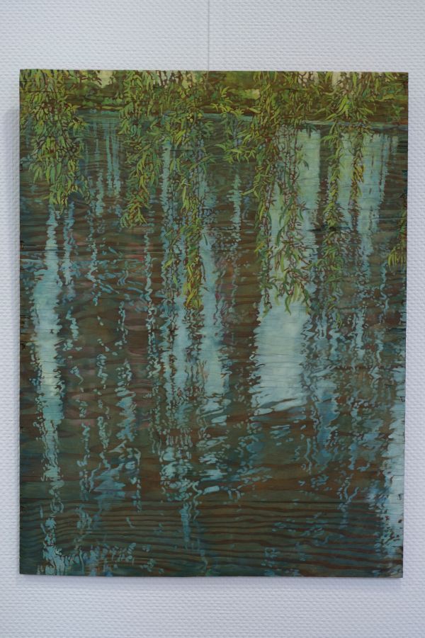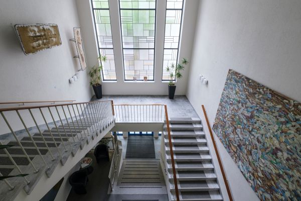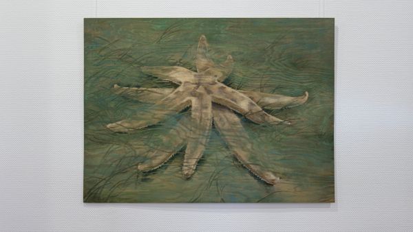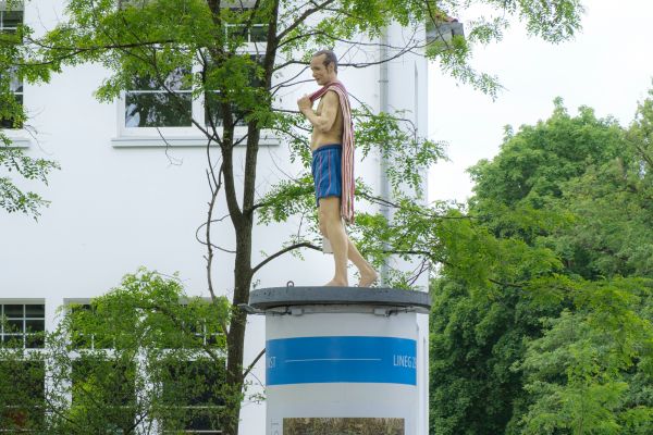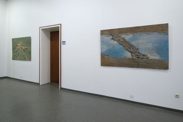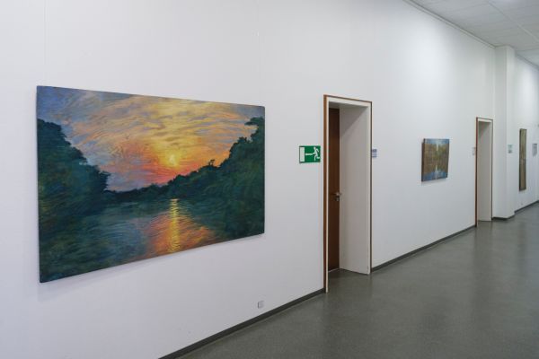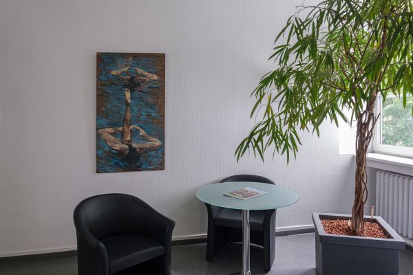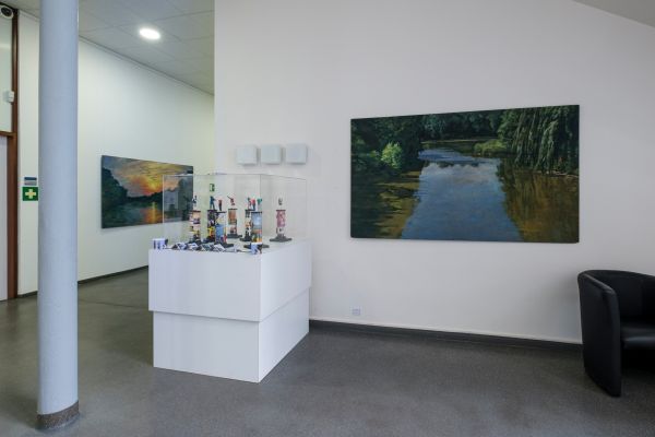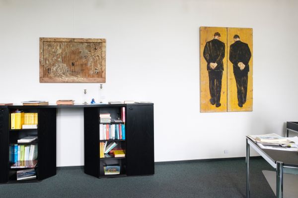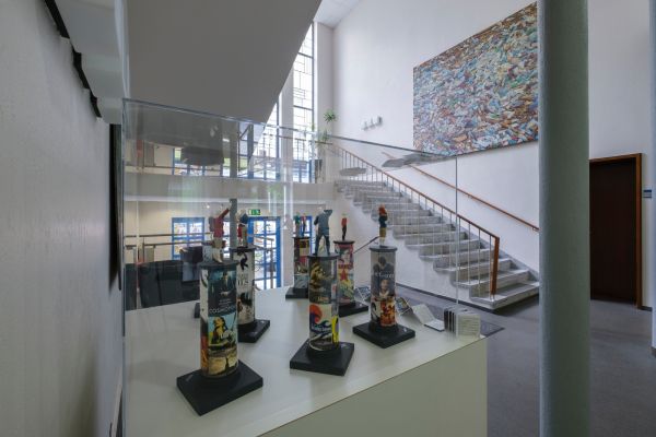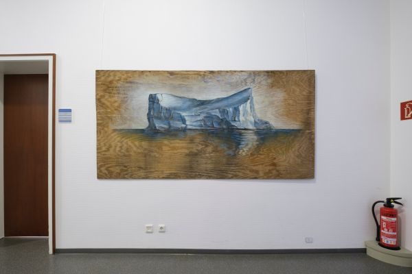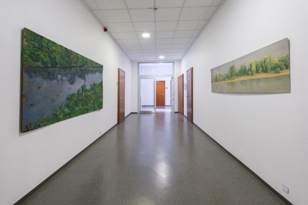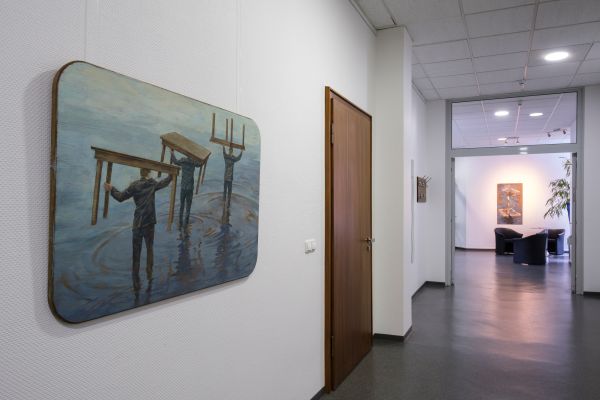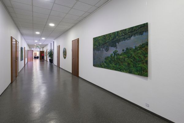 Neben einer Skulptur des Projektes "Säulenheilige" vor dem Gebäude, werden vorwiegend große Werke der Malerei (Ölfarbe auf Holz) in den Räumen und Gängen der LINEG präsentiert.